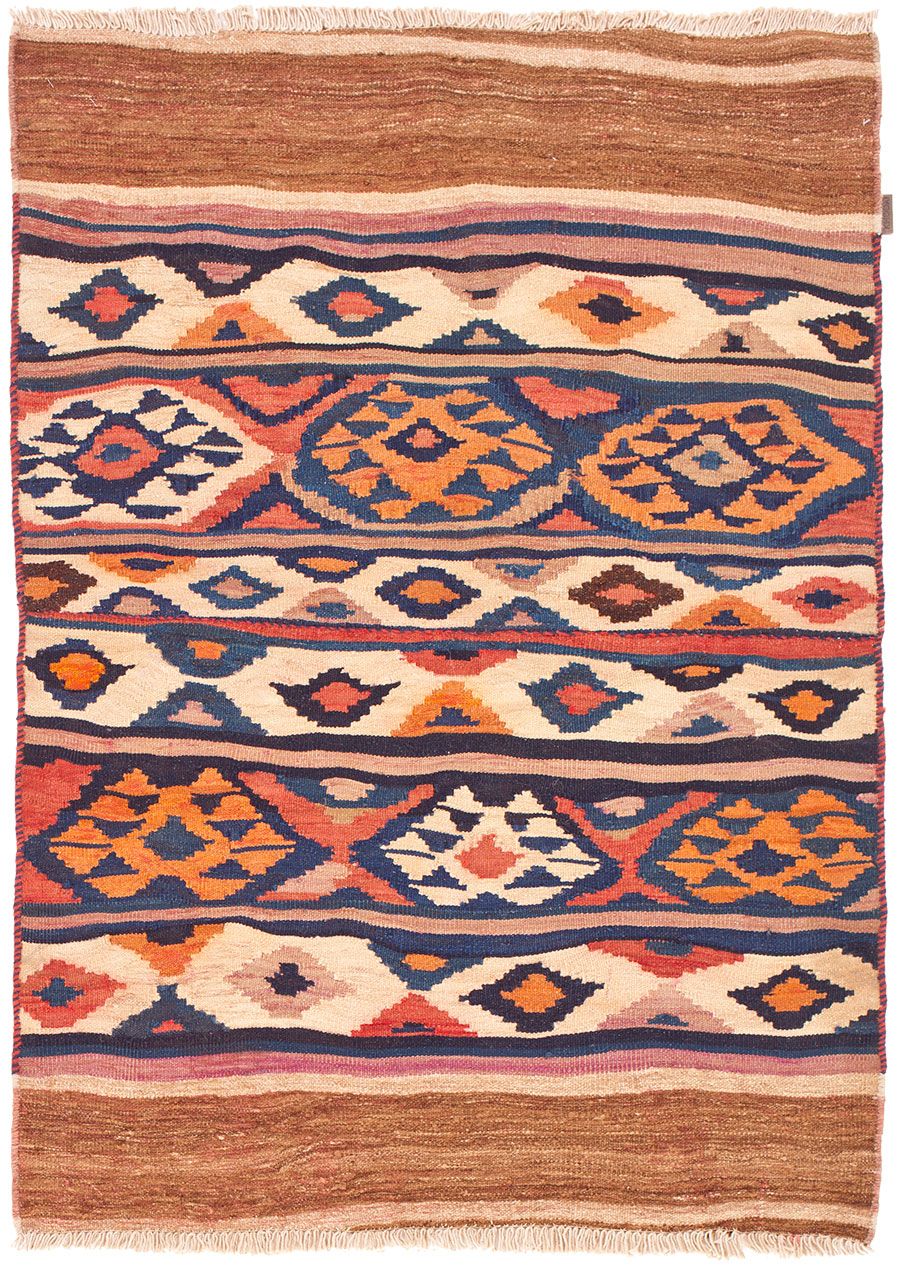 Von Nomaden & Bauern, ausschließlich nach traditioneller Methode handgefertigt, ist diese seltene Kelimart das Ergebnis wahrer Handwerkskunst. Diese seltenen Einzelstücke sind sowohl am Boden als auch an der Wand ein Blickfang!