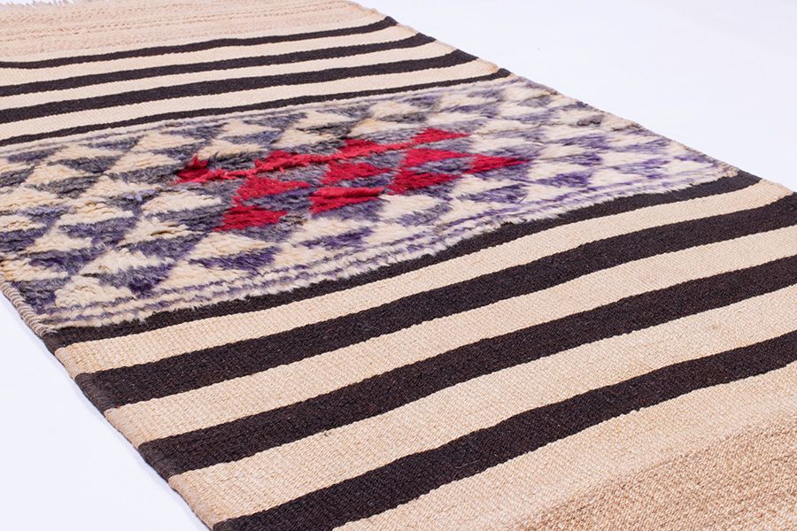 Von Nomaden & Bauern, ausschließlich nach traditioneller Methode handgefertigt, ist diese seltene Kelimart das Ergebnis wahrer Handwerkskunst. Diese seltenen Einzelstücke sind sowohl am Boden als auch an der Wand ein Blickfang!