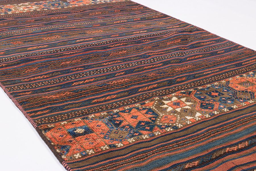 Von Nomaden & Bauern, ausschließlich nach traditioneller Methode handgefertigt, ist diese seltene Kelimart das Ergebnis wahrer Handwerkskunst. Diese seltenen Einzelstücke sind sowohl am Boden als auch an der Wand ein Blickfang!