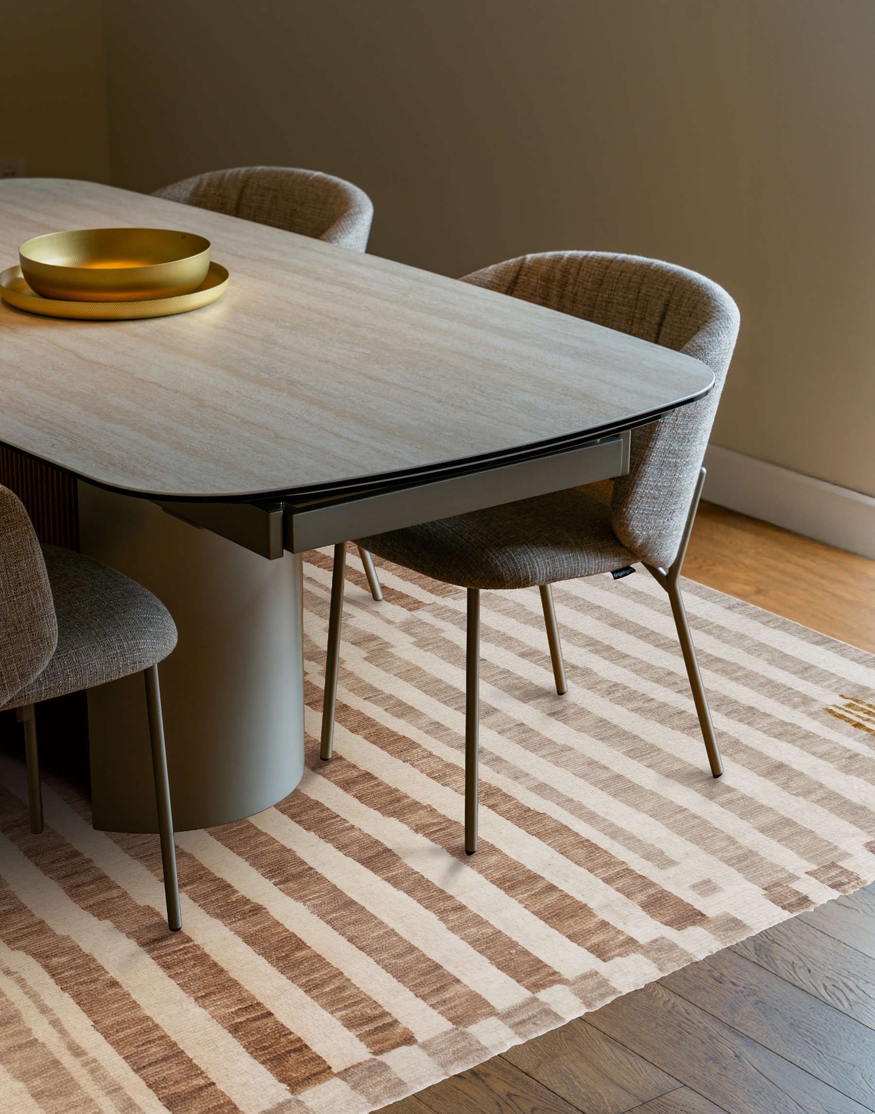 Regular Teppiche werden Knoten für Knoten per Hand geknüpft. Die Wolle wird zusätzlich leicht gefilzt und von Hand an der Spindel zu einem Garn gesponnen. Dieser aufwendige Zwischenschritt erzeugt im Endprodukt eine weiche und angenehme Haptik. Die aufwän