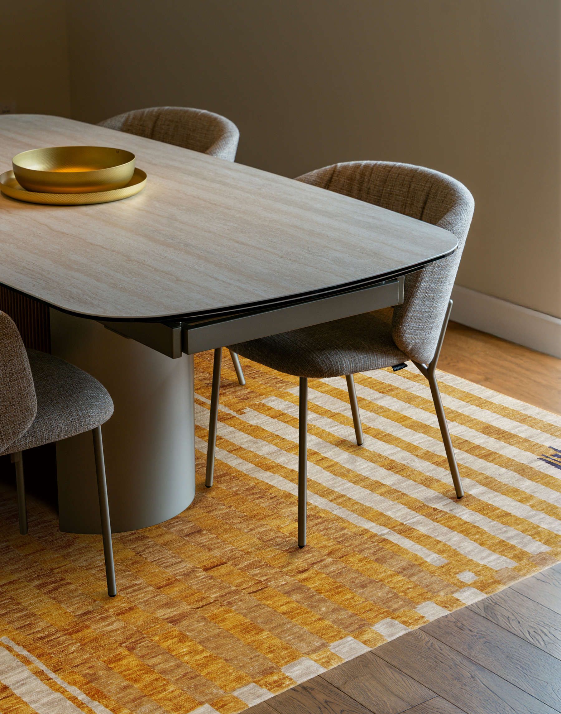 Regular Teppiche werden Knoten für Knoten per Hand geknüpft. Die Wolle wird zusätzlich leicht gefilzt und von Hand an der Spindel zu einem Garn gesponnen. Dieser aufwendige Zwischenschritt erzeugt im Endprodukt eine weiche und angenehme Haptik. Die aufwän