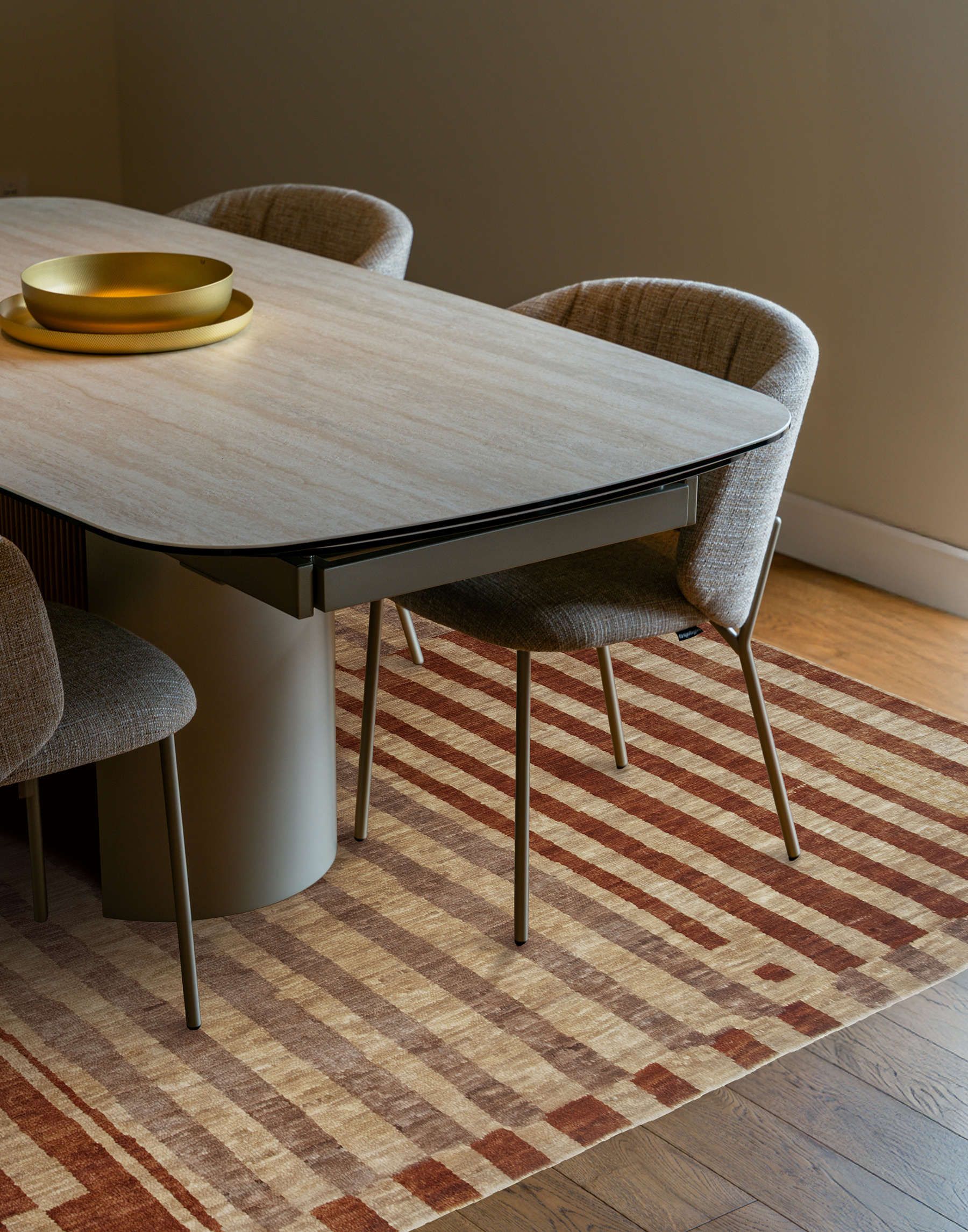 Regular Teppiche werden Knoten für Knoten per Hand geknüpft. Die Wolle wird zusätzlich leicht gefilzt und von Hand an der Spindel zu einem Garn gesponnen. Dieser aufwendige Zwischenschritt erzeugt im Endprodukt eine weiche und angenehme Haptik. Die aufwän